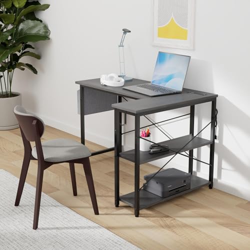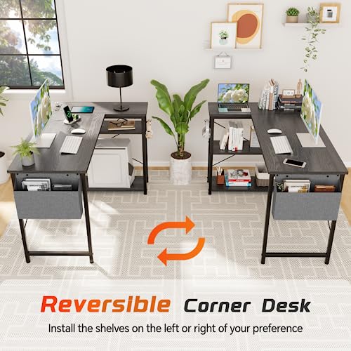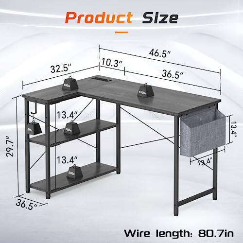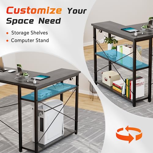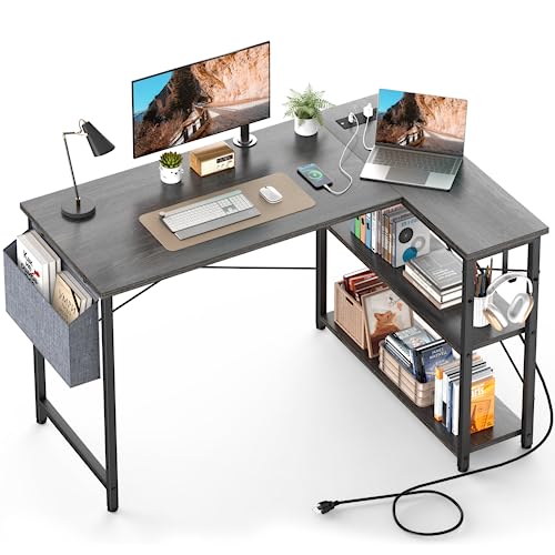 FEMOND - مكتب على شكل حرف L مقاس 119.38 سم مع منافذ ومنافذ USB قابل للانعكاس رفوف للمنزل والمكتب والدراسة والكتابة من فيموند لون أسود بلوط