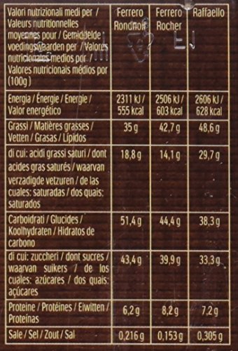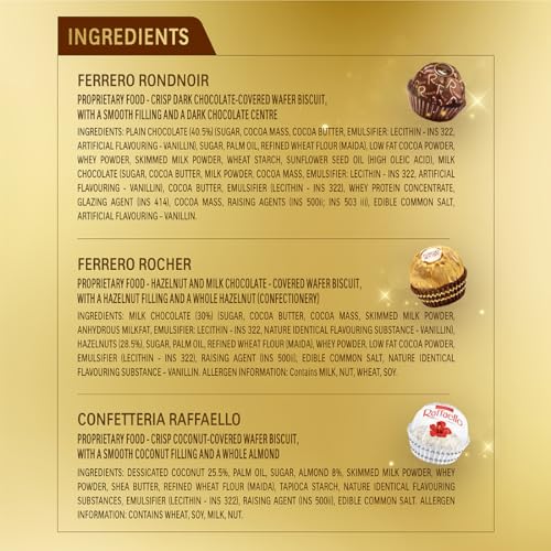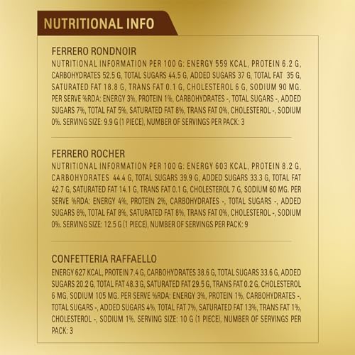 - مصنوعة من أجود المكونات، كل شوكولاتة في المجموعة هي تحفة فنية. من الحشوة الكريمية بالبندق في فيريرو روشيه إلى الحشوة باللوز وجوز الهند في رافاييللو، وصولًا إلى مركز الشوكولاتة الداكنة في روندنوار، كل قضمة هي تجربة طعم لا مثيل لها.