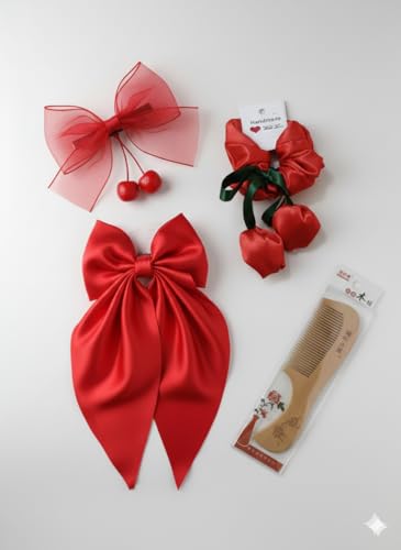 - مجموعة إكسسوارات شعر احتفالية: طقم من 4 قطع باللون الأحمر يتضمن فيونكة مشبك كبيرة، فيونكة شفافة بزينة كرز، ربطات شعر ستان، ومشط خشبي طبيعي