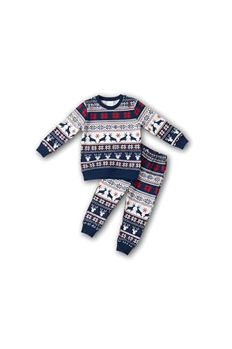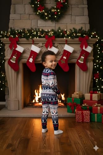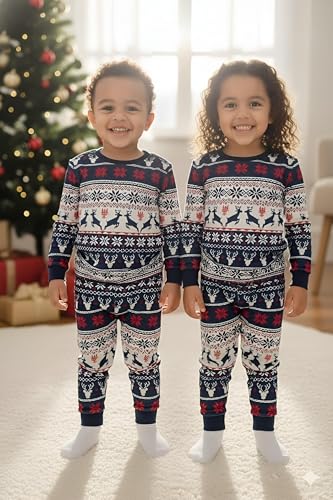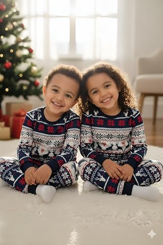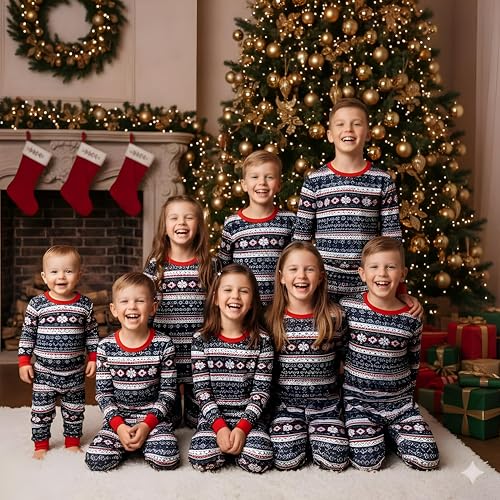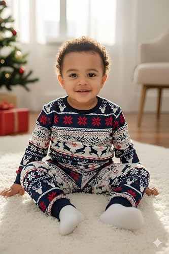 Generic - طقم بيجامة احتفالية - بيجامات متطابقة للكريسماس لأفراد الأسرة مع نقوش ندفة الثلج بنمط فير ايل وحواف حمراء وأكمام طويلة لإضفاء البهجة في الأعياد