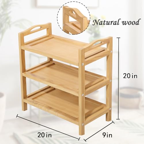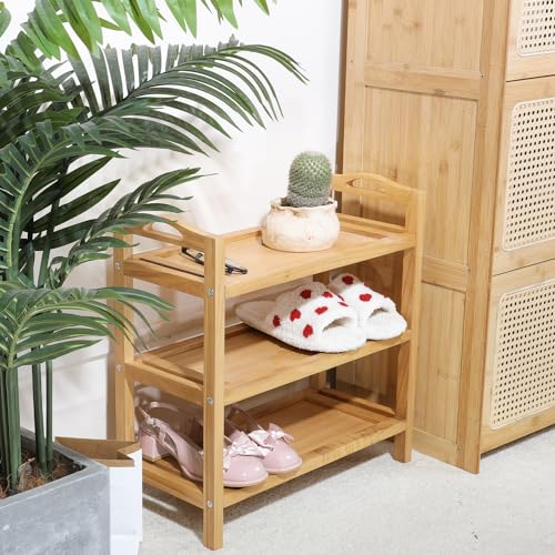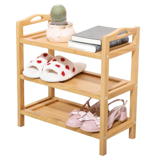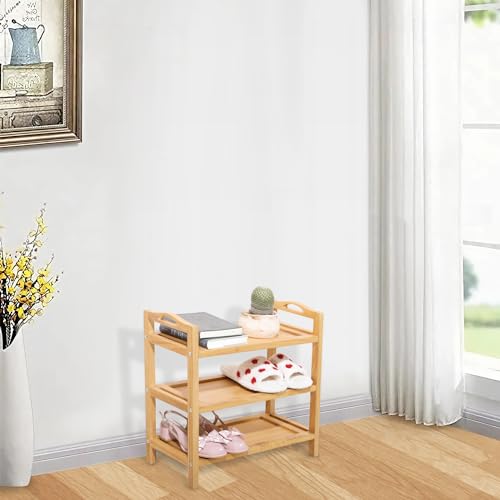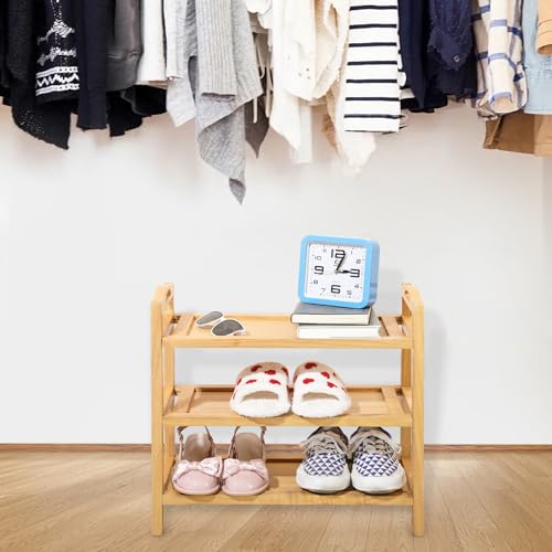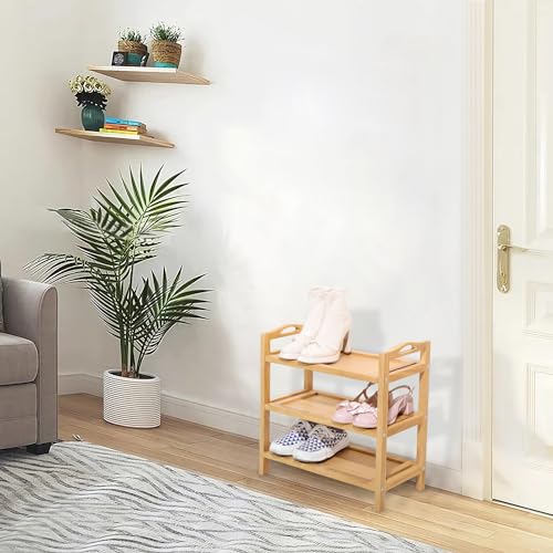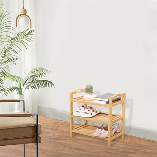 FEUFOAM - رف أحذية من 3 طبقات من فيوفوم، رف أحذية قائم بذاته عريض من الخشب، منظم احذية قابل للتكديس للخزانة والمدخل والحمام وغرفة النوم، لون أصفر فاتح