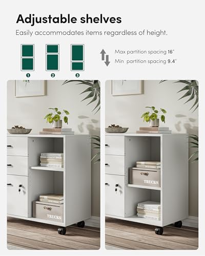FEZIBO - دواليب تخزين ملفات جانبية متحركة من 3 أدراج مع قفل حامل طابعة وسكانر أرفف مفتوحة فيزيبو ، لون أبيض خشب