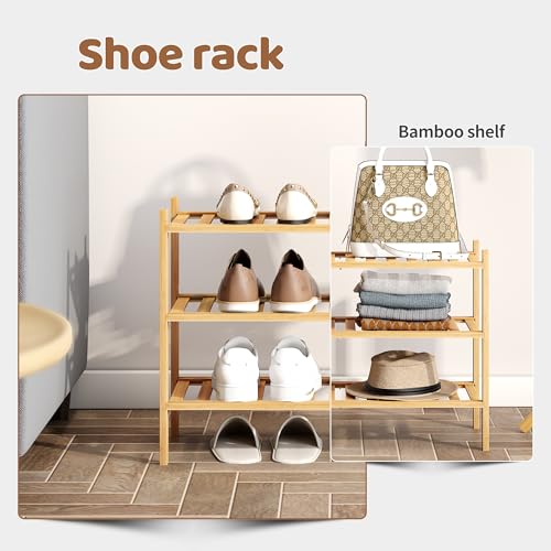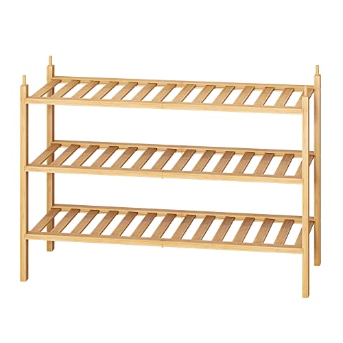 FILWH - اف اي دبليو اتش رف احذية من الخيزران قابل للتكديس، منظم تخزين للوحدة والمدخل والرواق والخزانة، رف احذية قوي قائم بذاته طبيعي (3 طبقات)