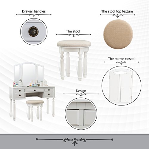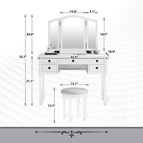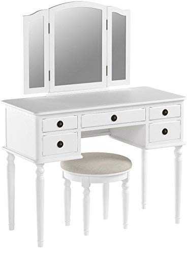 Fineboard - طقم طاولة مكياج مكون من ثلاث مرايا من فاين بورد، 5 ادراج للتنظيم، ابيض