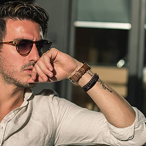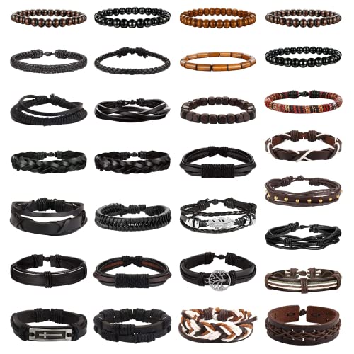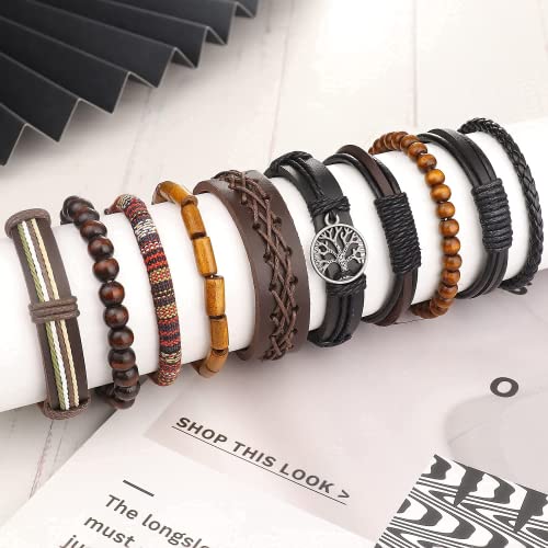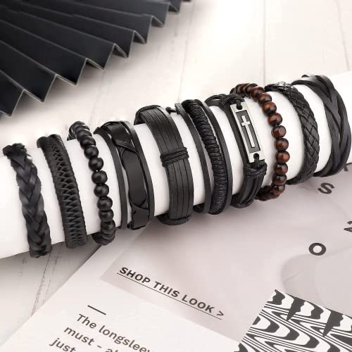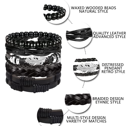 Finrezio - مجموعة اساور معصم عريضة منسوجة ومضفرة من الجلد قابلة للتعديل من خرز خشبي وحليات علي شكل ريشة وصليب بنمط تراثي قبلي للرجال والنساء من 29 قطعة لون اسود وبني من فينريزيو, جلد