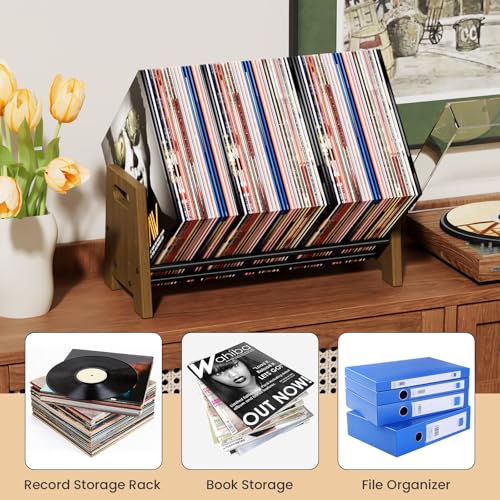 First-zgel - حامل اسطوانات فينيل من فيرست زجل، رفوف تخزين خشبية 80-100 LP، منظم خزانة كتب قابل للامالة، حامل سجل للكتب/الاقراص المضغوطة/عرض المجلات، بني ريفي
