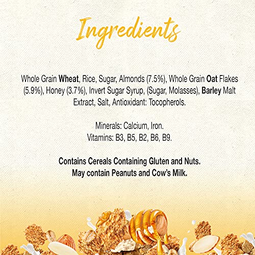 - المكونات: حبوب الحبوب (حبوب قمح كاملة (تحتوي على الجلوتين) والأرز) والسكر واللوز (5.7%) والعسل (4.1%) وشراب السكر البني المقلوب جزئيًا ومستخلص الشعير (يحتوي على الجلوتين) والملح ومنظم حموضة: فوسفات ثلاثي الصوديوم، مضاد أكسدة: توكوفيرولز.