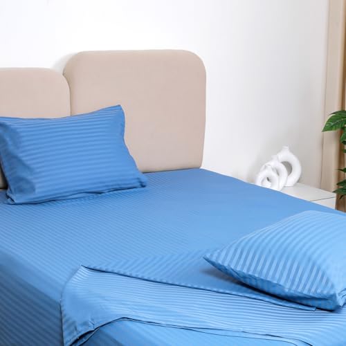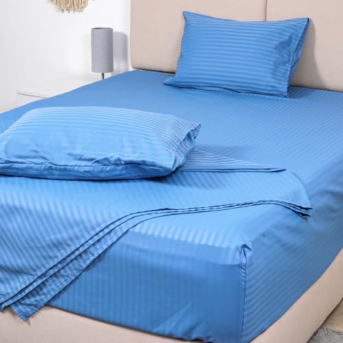 بد اند هوم BedNHome - طقم ملاية سرير بحواف مطاطية مثبتة بأستك من الساتان بنمط مخطط - بلون أزرق مقاس 1.40 × 2 م