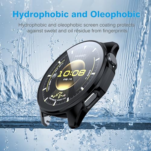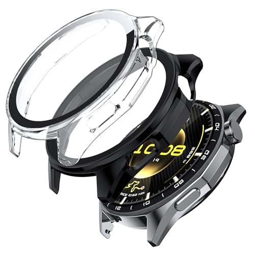 Fitudoos - جراب لساعة هواوي جي تي 6 46 ملم، حافظة صلبة من البولي كربونات مع شاشة حماية من الزجاج المقوى، مضادة للسقوط وحساسية عالية - 1 شفاف + 1 اسود، قطعتين من فيتودوس