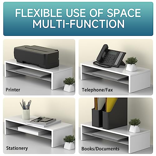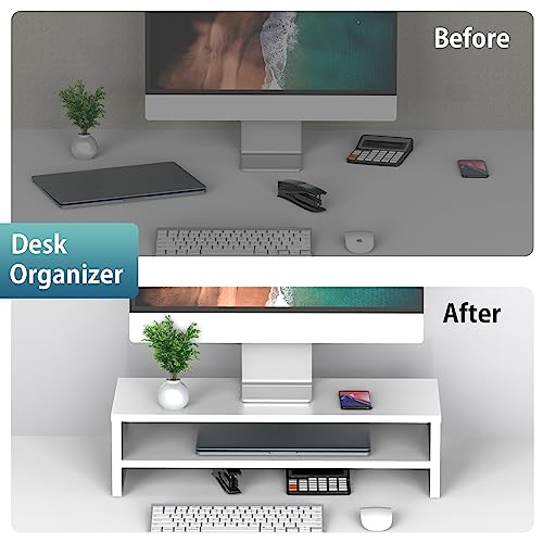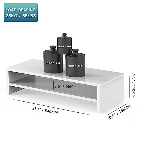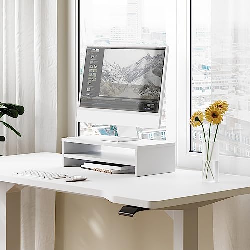 FITUEYES - حامل شاشة من طبقتين من فيت يو ايز، حامل شاشة كمبيوتر 54 سم، حامل خشبي لسطح المكتب لرفع شاشة اللاب توب مع رف تخزين، أبيض