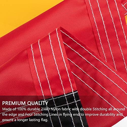 - جودة فائقة - هذا العلم مصنوع من قماش نايلون معاد تدويره بنسبة 100% متين وعالي الجودة بنسبة 100% مما يساعد على تحمل مجموعة متنوعة من الظروف الجوية القاسية؛ العلم الألماني مخيط بشكل مزدوج حول الحافة ومعزز برأس قوي وحلقتين نحاسيتين.