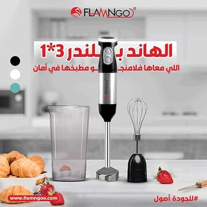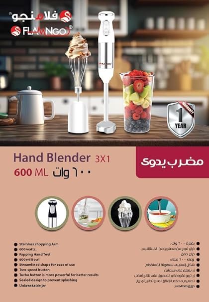 FLAMNGO - خلاط يدوي 3 × 1 بقدرة 600 وات مع ذراع مضرب ووعاء مضاد للكسر بسعة 600 مل، مزودة بسرعتين وزر تربو للحصول على نتائج أفضل من فلامنجو (لون أبيض)