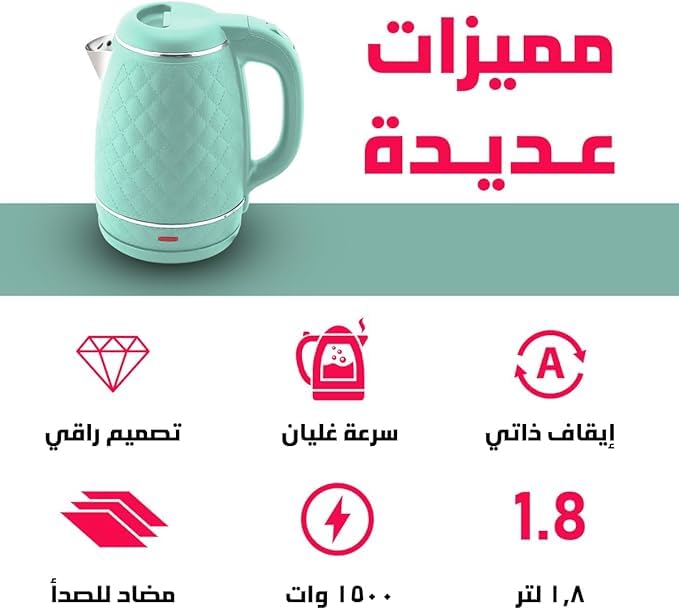 - غليان سريع: مزودة بعنصر تسخين قوي 1500 وات، هذه الغلاية تغلي الماء بسرعة، أي ستوفر لك الوقت والطاقة.