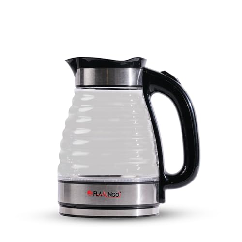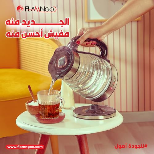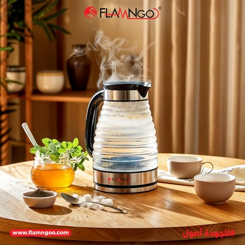 FLAMNGO - غلاية زجاجية كهربائية سعة 2 لتر بقوة 1500 وات بمؤشر ليد وعنصر تسخين من الفولاذ المقاوم للصدأ من فلامنجو