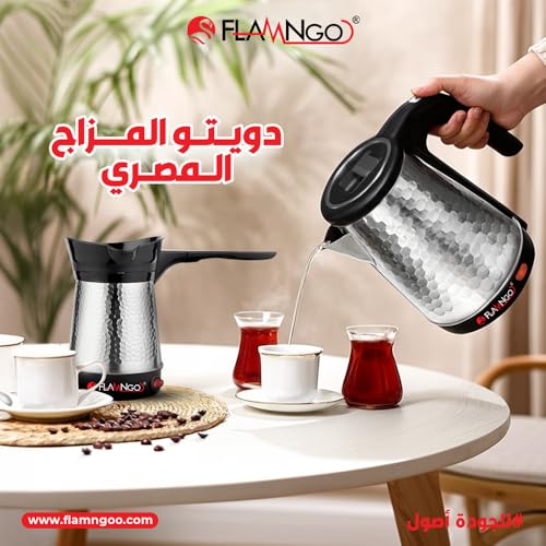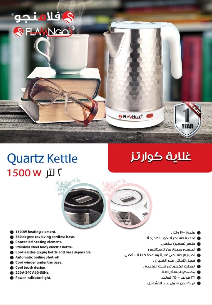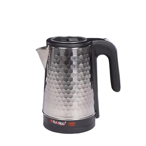 FLAMNGO - غلاية كهربائية كوارتز 1500 وات من الفولاذ المقاوم للصدأ بقاعدة لاسلكية 360 درجة وخاصية الإيقاف التلقائي من فلامنجو (لون أسود)
