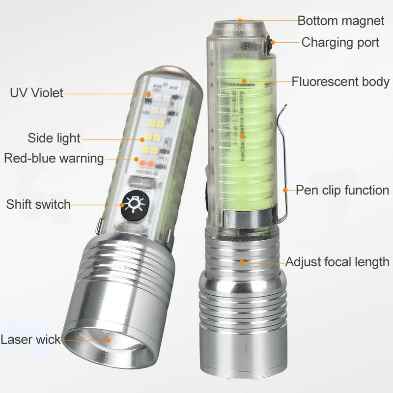 - 🌞 ليد: كشاف ليد بقدرة 50W🌞الاستخدام: ركوب الخيل والإضاءة اليومية والتخييم والطوارئ وما إلى ذلك 🌞المقاس: 12.8 × 3.4 × 2.1 سم 🌞البطارية: بطارية مدمجة 18650، قابلة لإعادة الشحن من النوع C. 🌞مادة الكشاف: بلاستيك بولي كربونات وخليط معدني من الألومنيوم 🌞السرعة: ① 3 مستويات من الضوء الرئيسي: (ضوء قوي، ضوء ضعيف، ضوء وامض) ② ضوء جانبي 5 تروس: (6 أضواء ليد أبيض و2 × ضوء ليد أحمر و2 × ضوء ليد أزرق وامض بالتناوب - 6 × ضوء ليد أبيض 2 × ضوء ليد أرجواني 2 × ضوء ليد أحمر و2 × ضوء ليد أزرق وامض بالتناوب) 🌞إذا استخدمت أي وضع لأكثر من 8 ثوانٍ فإنه يمكنك إيقاف تشغيل الفلاش عبر النقر على زر التشغيل.