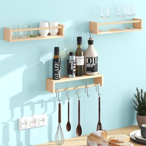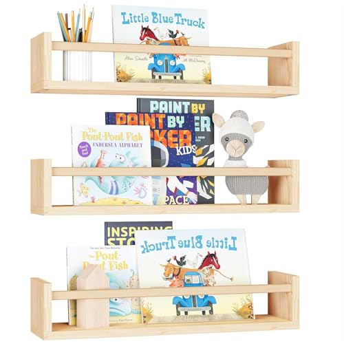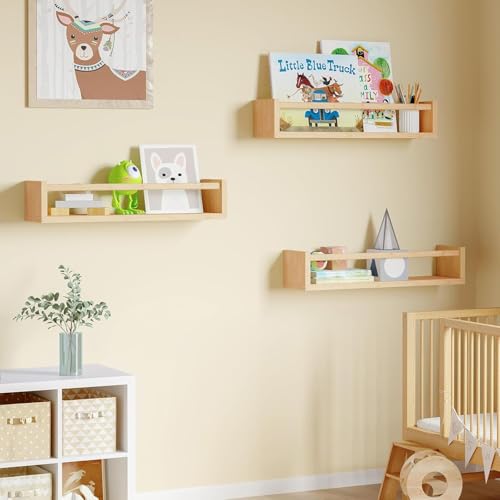 Phugis - رفوف كتب عائمة لغرفة الاطفال، 3 قطع من الارفف الخشبية العائمة لغرفة الاطفال، رف كتب خشبي صغير يثبت على الحائط للاطفال الاولاد والبنات، تخزين الالعاب والديكور لغرفة النوم (خشب طبيعي)