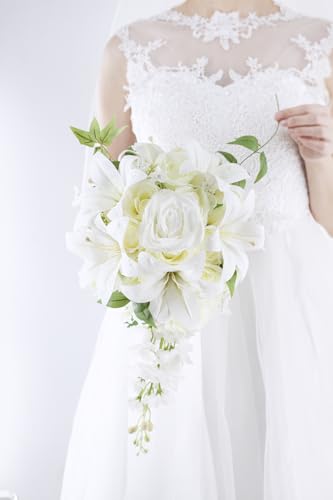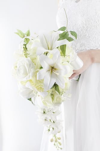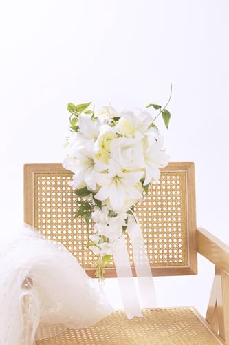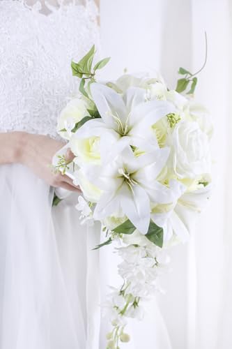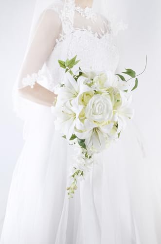 Floinla - باقة زفاف متتالية من فلوينلا، باقات زفاف بلون ابيض عاجي للعروس ووصيفة العروس مقاس 10 انش، باقة زهور صناعية لتزيين حفلات الزفاف