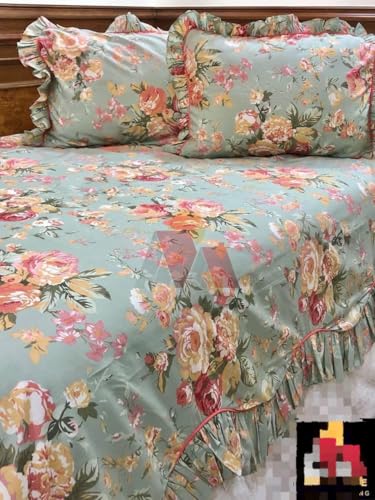Generic - طقم سرير بنقشة الورود، أخضر نعناعي مع زهور ملونة، تصميم كشكش