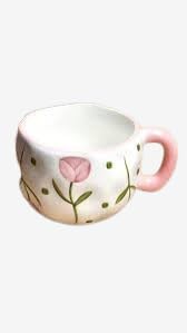 - عناصر التصميم: نمط زهور التوليب الوردي الجميل مرسوم يدويًا على سيراميك أبيض نقي مع سيقان وأوراق خضراء رقيقة