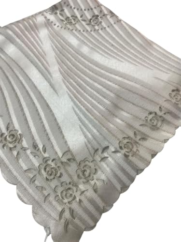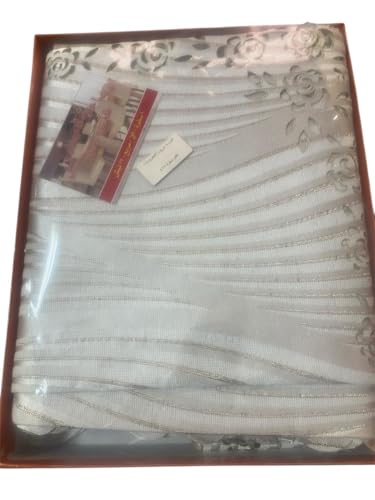 - ١) تصميم فاخر: مفرش طاولة أنيق مزين بنقوش الورود المطرزة بدقة، مع خطوط متموجة تضيف لمسة من الأناقة والفخامة