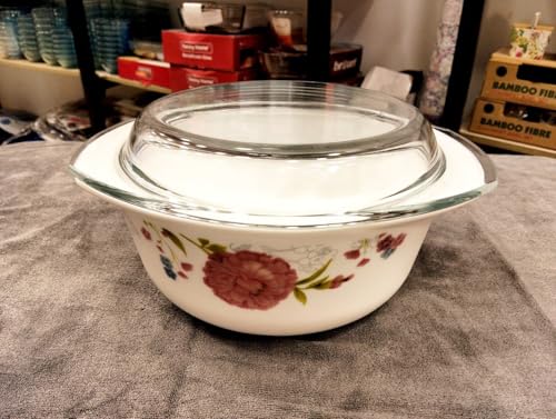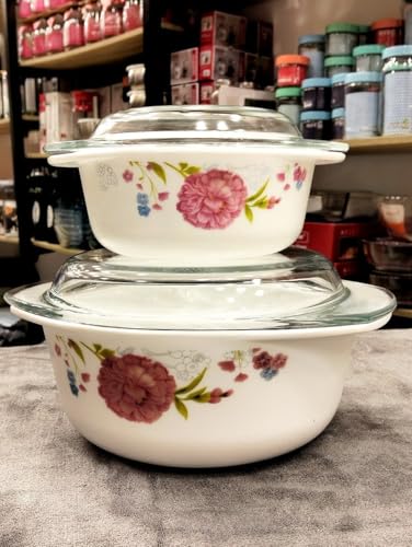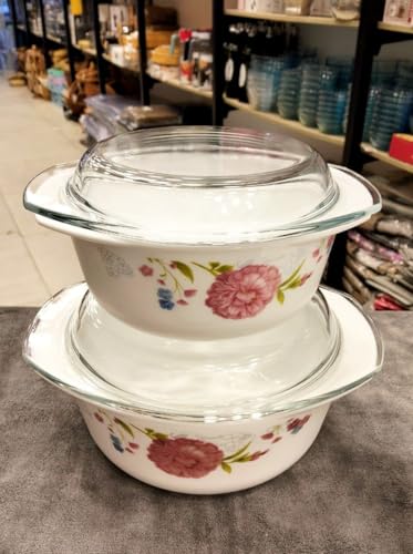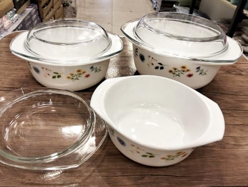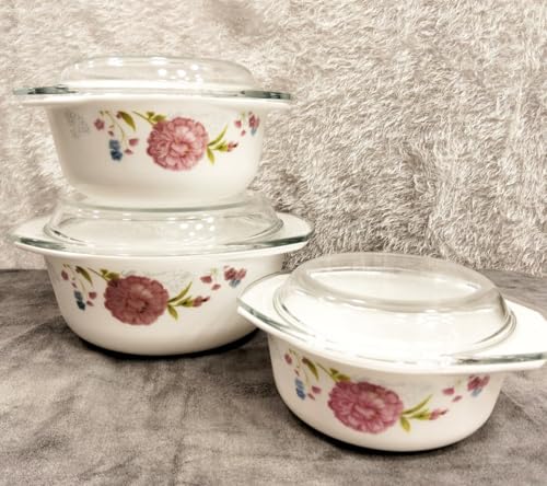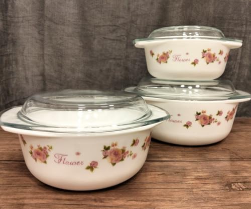 Generic - طقم كسرولة بغطاء زجاجي بتصميم ورود، 3 قطع (2.5 لتر و1.5 لتر و1 لتر)، بلون أبيض مع نقشة زهور وردية.