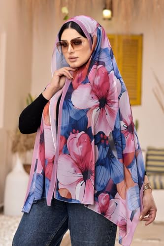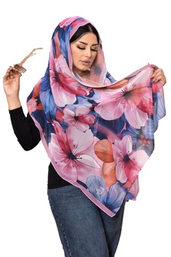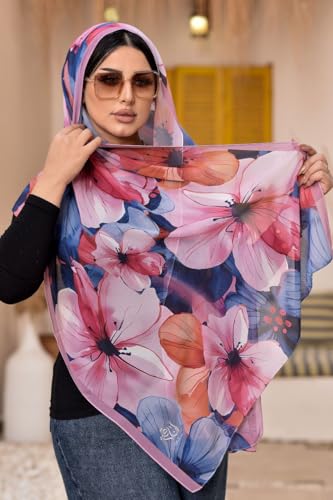 Anaqah Scarf - وشاح حجاب شيفون بطباعة زهور، لون بينك وازرق كحلي، حجاب فاخر فريد للنساء