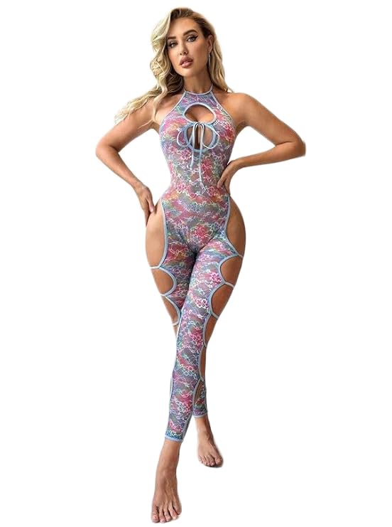 Generic - سالوبيت بكباسين مطبوع عليه زهور ورباط بتصميم مفرغ بنمط بينك وازرق بطول كامل، مقاس واحد