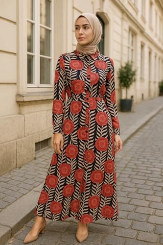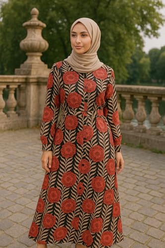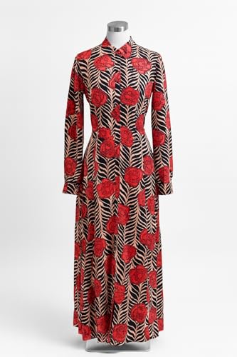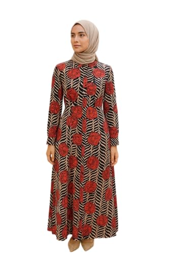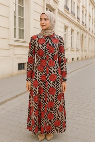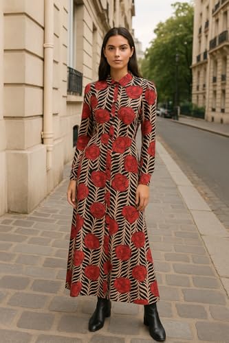 Generic - فستان ماكسي بأكمام طويلة وطبعة زهور، بنقشة حمراء وسوداء مع أوراق شجر بلون بيج، مقاس 8