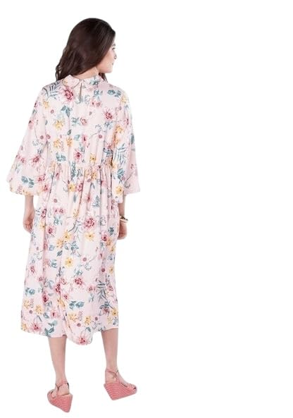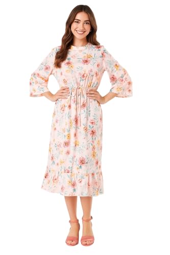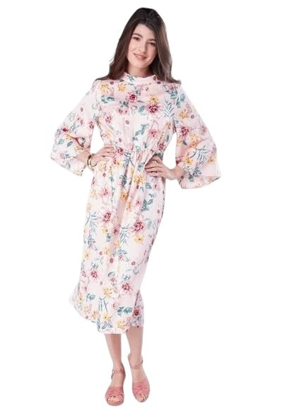 Generic - فستان متوسط الطول بطبعة زهور واكمام مرفرفة، بينك متعدد الالوان، نمط صيفي كاجوال مقاس 18
