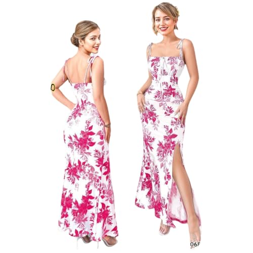 Generic - فستان ماكسي مكشكش بطبعة زهور مع فتحة على الفخذ واشرطة ربط