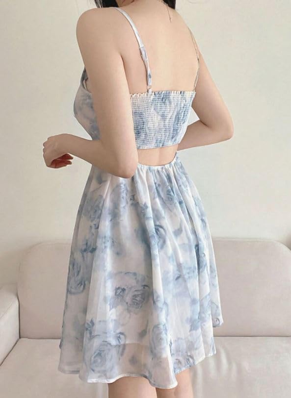 Generic - فستان صيفي برقبة سكوير للنساء، بدون أكمام، بحمالات سباغيتي وخصر امباير، مزين بطباعة الزهور، باللون الأزرق الفاتح والأبيض