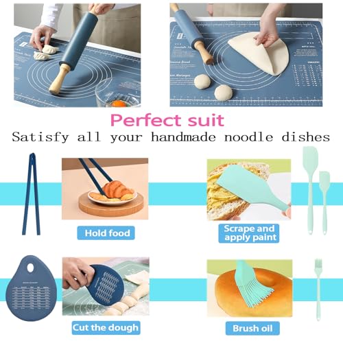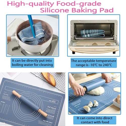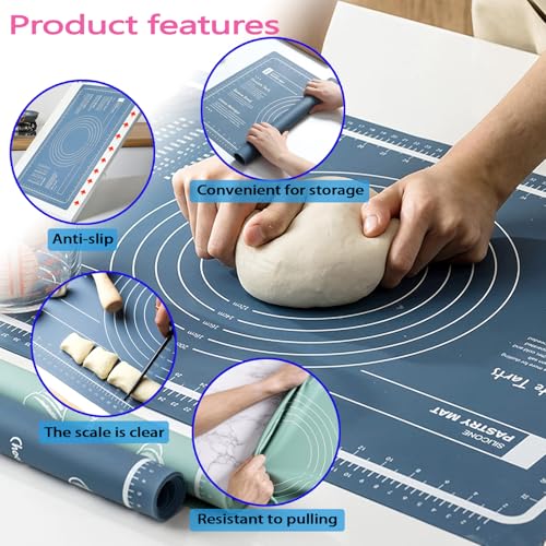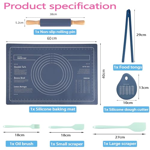 FLOVESUNS - طقم مفرش للخبز سيليكون 60 × 40 سم من فلوفسانز - يتضمن نشابة عجين + مقشطة / فرشاة/ مساكة طعام، مفرش خبز مضاد للانزلاق لصنع البسكويت والخبز (لون أزرق)