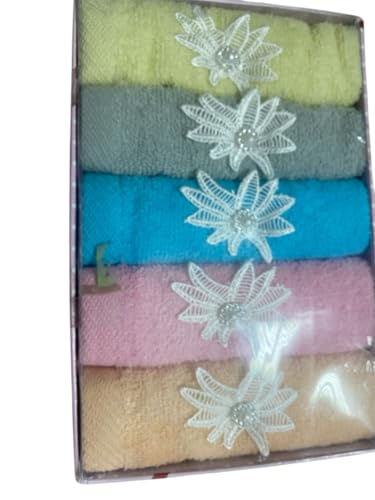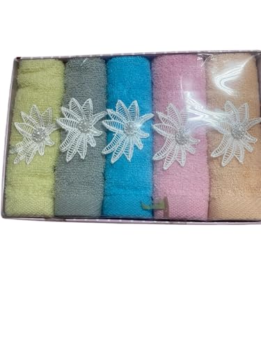 Generic - مناشف قطنية بتطريز زهور، مجموعة 5 قطع، ألوان متعددة (أخضر فاتح، رمادي، أزرق، وردي، بيج) _ فوط مقاس 30 * 30 سم تناسب اغراض متعدده _ علبه بشكل يلائم الهدايا وجهاز العرايس
