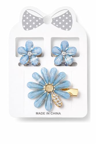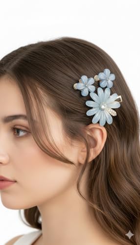 - تصميم زهري أنيق: الأقراط والمشبك مصممة بشكل زهور باللون الأزرق الفاتح مع لمسات ذهبية وكريستال متلألئ في المركز لإطلالة جذابة