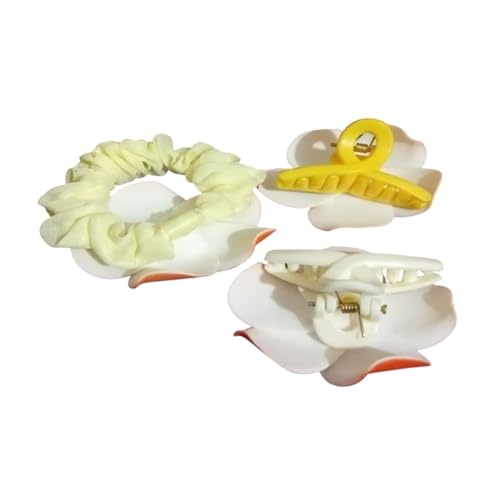 - ١) تصميم جذاب: مشابك شعر على شكل زهور جميلة بألوان البرتقالي والأبيض والأصفر مع لؤلؤة في المنتصف