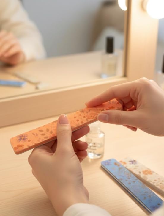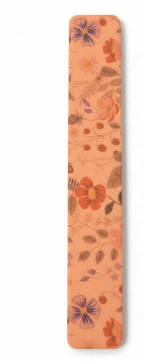 - تصميم زهري جذاب: مبرد أظافر مزين بنقوش زهور ونباتات ملونة بدرجات البرتقالي والبنفسجي على خلفية خوخية دافئة لإضفاء لمسة جمالية على أدوات العناية