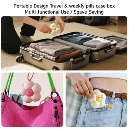 Generic - منظم أدوية على شكل زهرة مع وجه مبتسم، حامل حبوب محمول، صندوق تخزين متعدد الأقسام، 9x9x4.1 سم، مع حبل يد الألوان ابيض
