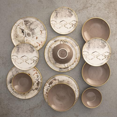 - تصميم أنيق: طقم عشاء مكون من 24 قطعة يتميز بالبورسلين المتطور بلون الكاكاو مع إطارات ذهبية فاخرة، مثالي لتناول الطعام الرسمي والمناسبات الخاصة