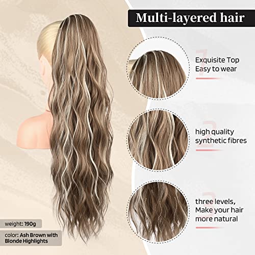 Flufymooz - FLUFYMOOZ 26 inches Ponytail Extensions Drawstring Ponytail for Women Long Curly Natural Wavy Synthetic Hair for Women (26 inches, Ash Brown with Blonde Highlights)