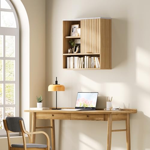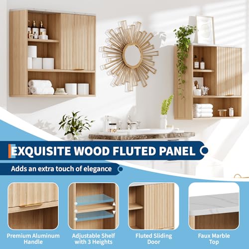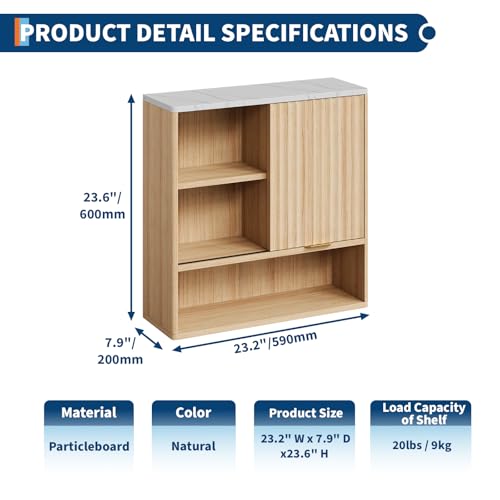 GarveeHome - دولاب حائط للحمام مضلع مع باب منزلق، خزانة أدوية بجزء علوي من الرخام الصناعي، رف قابل للتعديل ومساحة تخزين مفتوحة، منظم تخزين يثبت على الحائط بتصميم منحني لغرفة غسيل الملابس - طبيعي