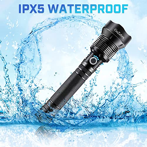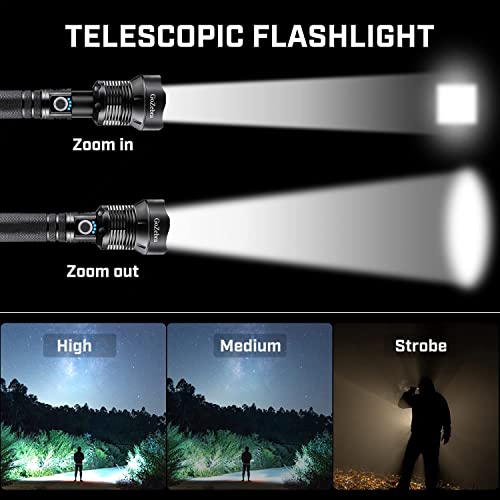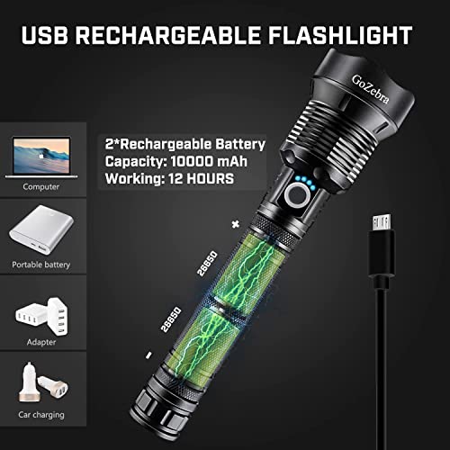 Flyalcon - مصباح ليد يدوي وتكتيكي بإضاءة عالية 90000 لومن قابل لإعادة الشحن بمنفذ USB فائق السطوع وقابل للتكبير ومقاوم للماء مع بطارية 26650 و3 أوضاع للأماكن الخارجية والطوارئ من فلايلكون