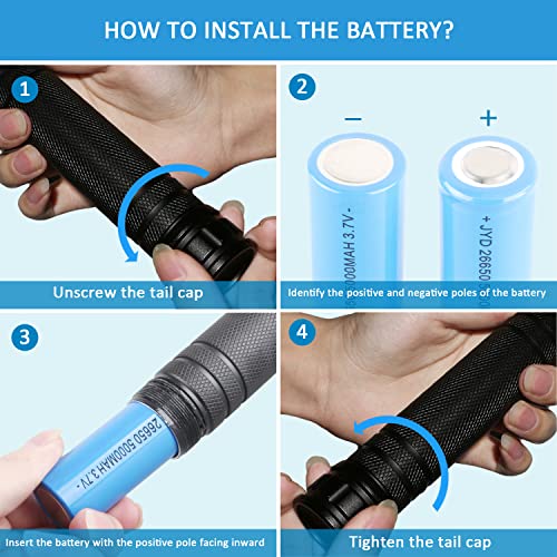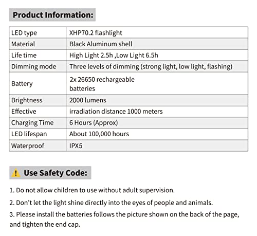 - 【مصباح يدوي فائق الإضاءة】 يمنحك مصباح ليد عالي السطوع 90000 من فلايلكون إضاءة ساطعة وشعاع قوي حيث يمكن أن يضيء غرفة بأكملها بسهولة والتركيز على الأشياء التي يصل طولها إلى 305 متر محتويات العبوة: 1 × مصباح ليد يدوي ليد P70 و2 × بطارية 26650 و1 × كابل USB.