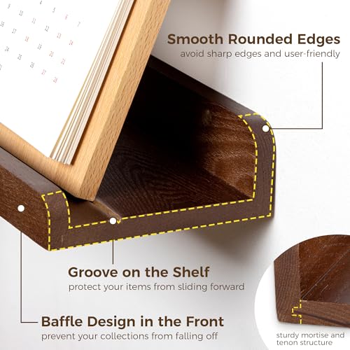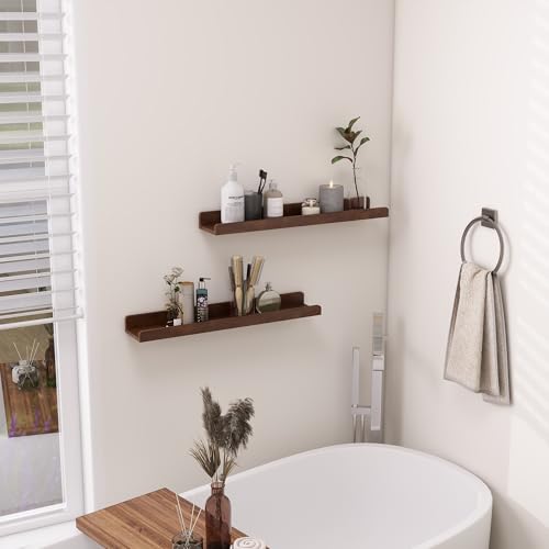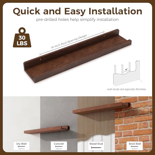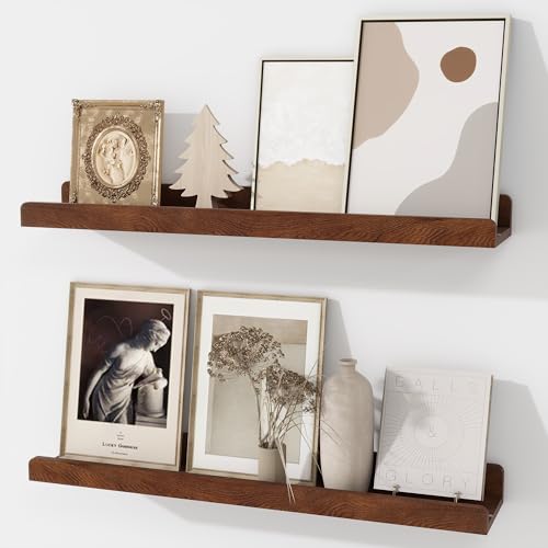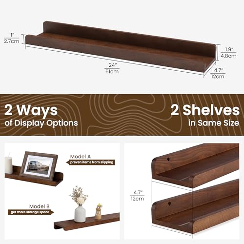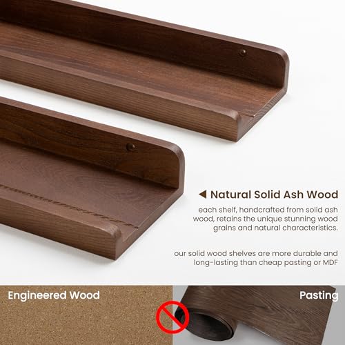 FLYJOE - مجموعة أرفف صور عائمة من خشب الدردار الصلب مقاس 60 سم مع حافة، رف صور بلون خشبي داكن للحائط مع حافة من فلايجو - لون خشب الجوز الداكن، قطعتان