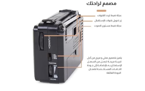 - سهل الاستخدام: أزرار تحكم بسيطة ومقياس تردد واضح مع مؤشرات لكل نطاق موجي لضبط المحطات بسهولة ودقة