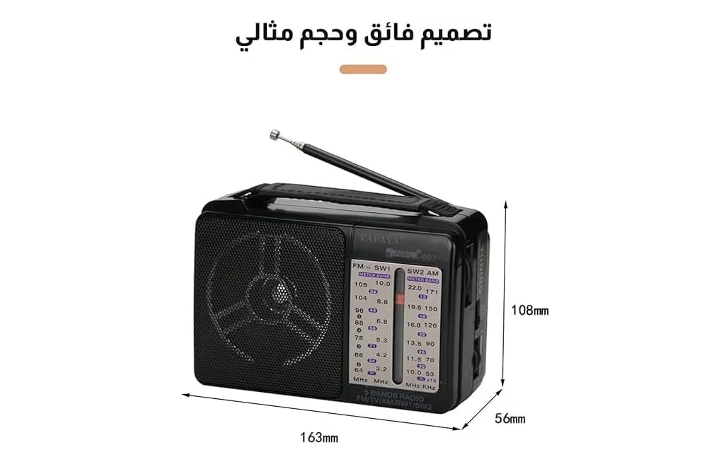 - استقبال متعدد الموجات: راديو PAPAYA يدعم استقبال موجات FM وSW1 وSW2 وAM مع حساسية عالية لاستقبال واضح ومتنوع للمحطات الإذاعية