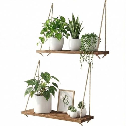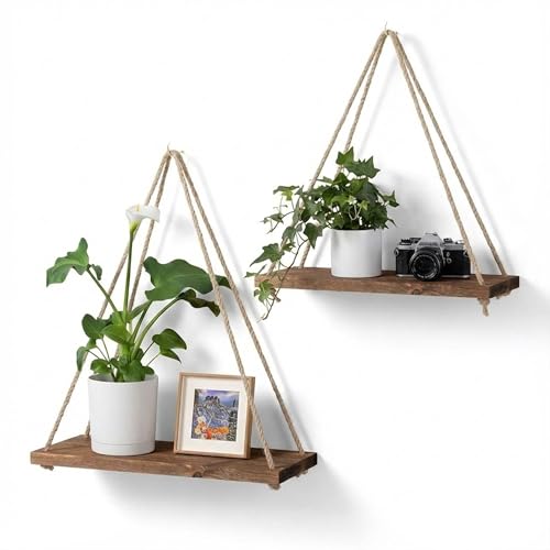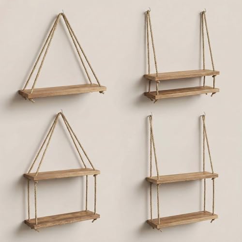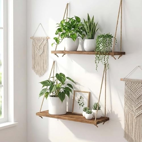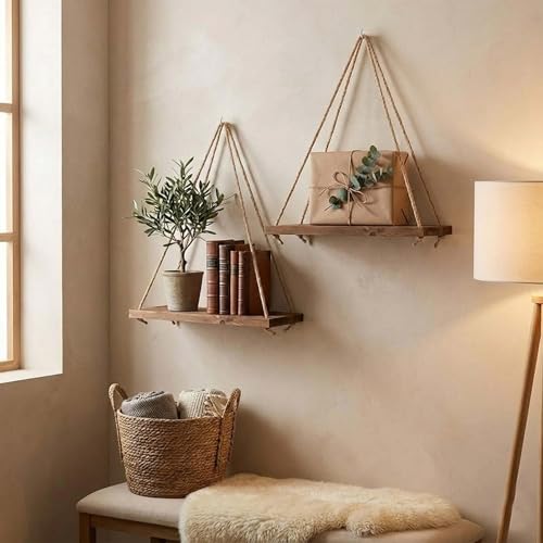 - تصميم معلق ريفي: مجموعة من رفين تعليق خشبيين مع حبل، مما يضيف سحرًا ريفيًا دافئًا وأسلوبًا طبيعيًا إلى أي غرفة.
