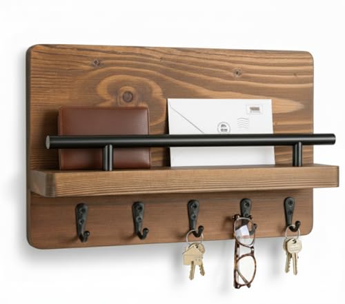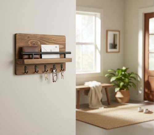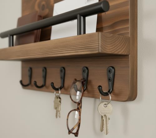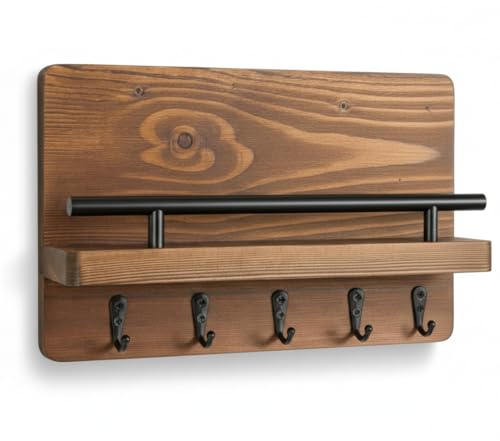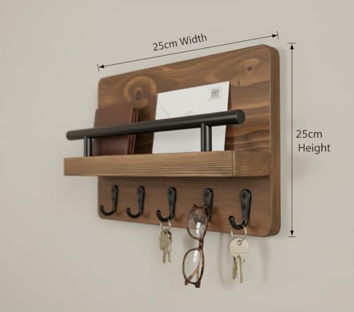 فنون - رف حائط منظم من الخشب و5 خطافات معدنية لتنظيم المفاتيح والمحافظ والنظارات، خشب طبيعي من فنون مقاس 25 سم
