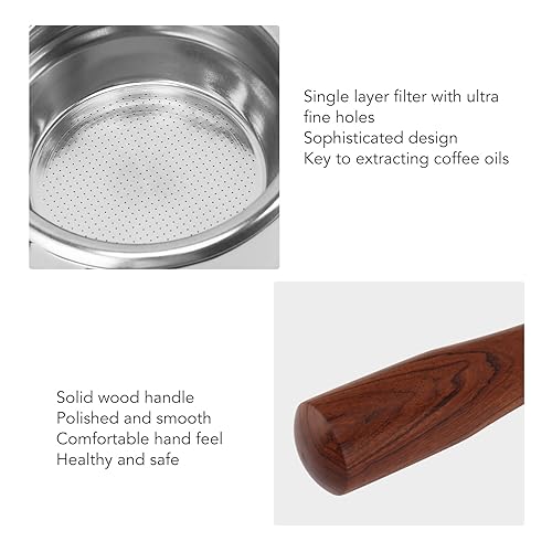 - تصميم بدون قاعدة يسمح المقبض بدون قاعدة للقهوة بالتدفق من الأسفل، مما يكشف تمامًا عن طعم القهوة وقوامها وتحسين جودة ومذاق القهوة.