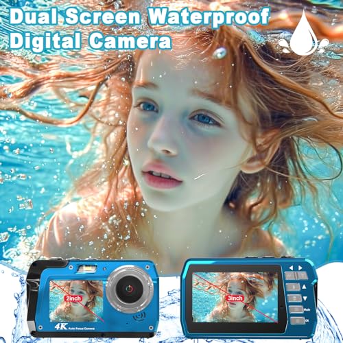 Focusify - كاميرا ديجيتال FHD عالية الوضوح تحت الماء 48MP دقة 4K مقاومة للماء، بطاقة ذاكرة 32 جيجا بايت، شاشة مزدوجة (3.0 بوصة+2.0 بوصة)، كاميرا سيلفي للتصوير مقاومة للماء حتى 3 متر للغطس وركوب الأمواج والتجديف